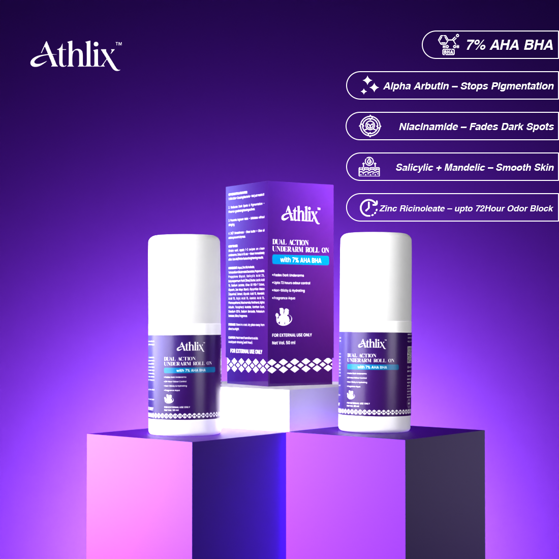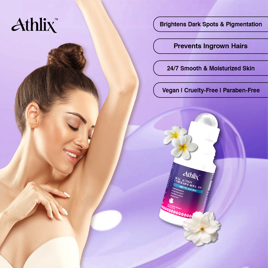 Athlix brings you India’s first athlete-centric roll-on with a long-lasting floral fragrance that uplifts your senses while fighting odor and darkness.