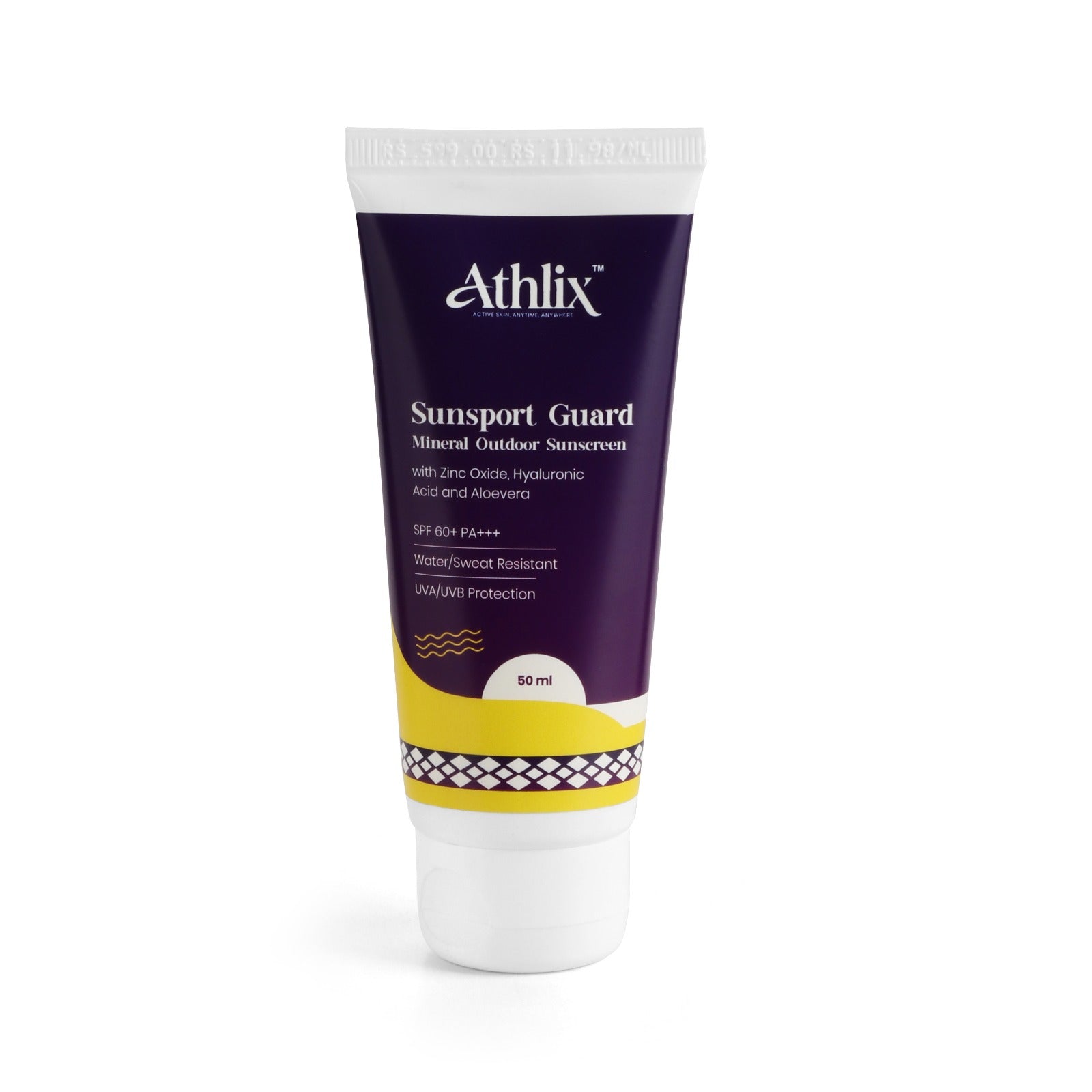✔ Athlix Outdoor Mineral Sunscreen with SPF 60+ & PA+++ (50ml) – Sweat-proof, water-resistant sunscreen designed for outdoor training, running, cycling, and adventure sports. Formulated with Zinc Oxide and Titanium Dioxide, it creates a physical barrier against UVA & UVB rays, preventing sunburn and long-term skin damage.
