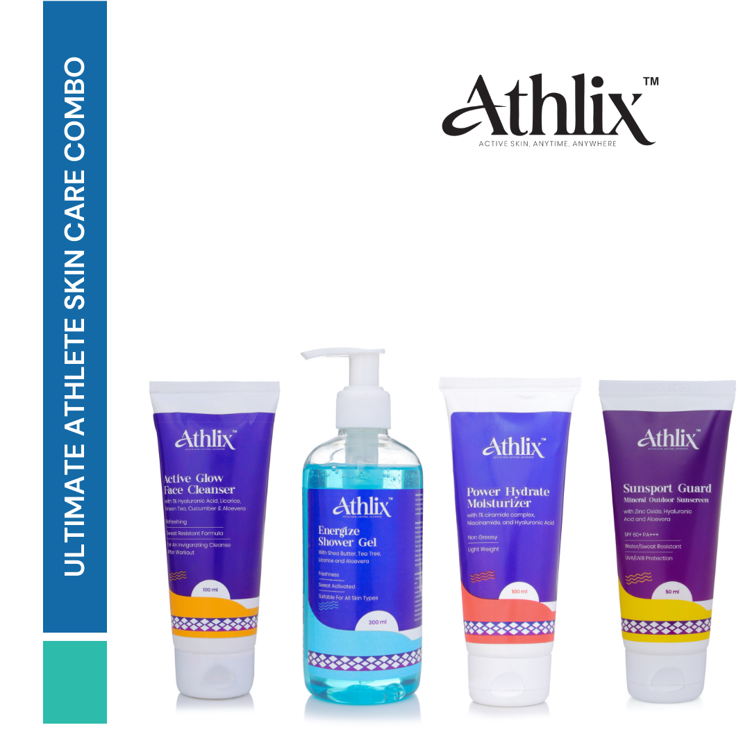 ✔ Athlix Active Glow Face Cleanser (100ml) – Removes sweat, excess oil, and dirt, unclogs pores, and refreshes the skin after intense workouts. Enriched with Cucumber and Niacinamide, it leaves your skin feeling clean, hydrated, and balanced.